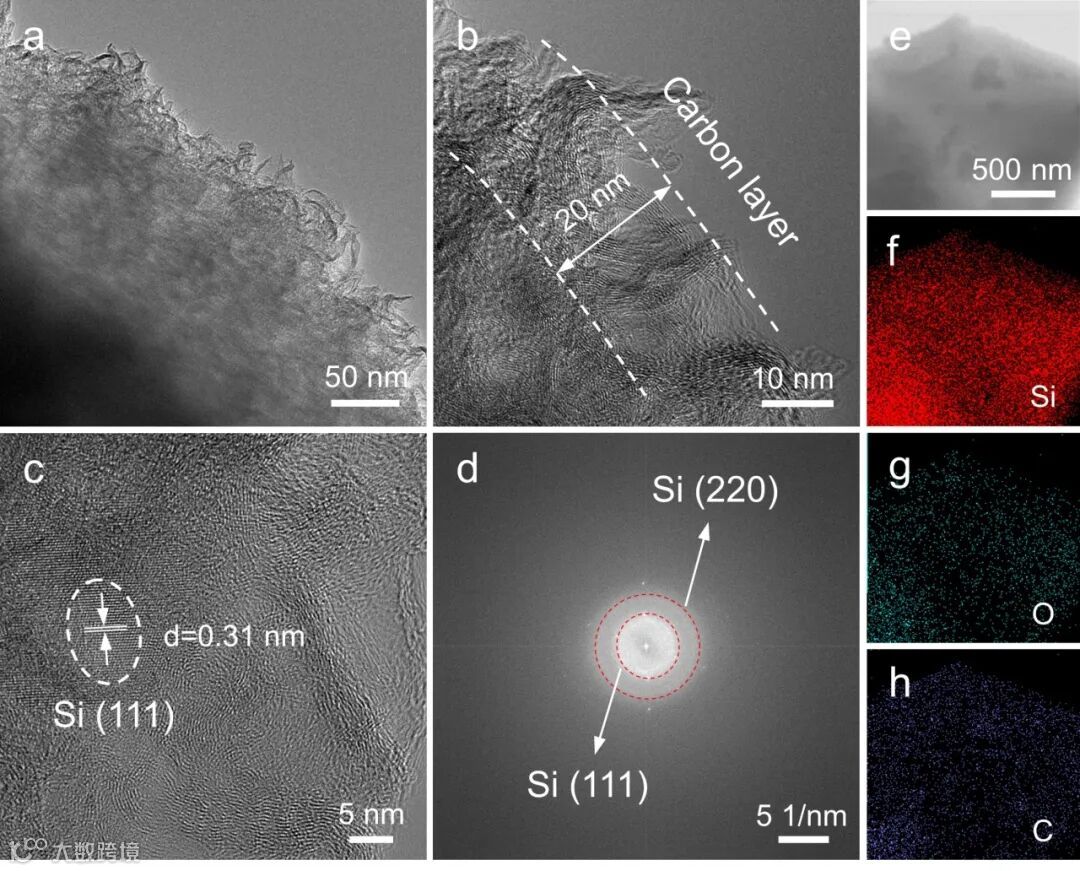 图4. (a-c) M-SiOx@C-0.75的不同分辨率的TEM图像和 (d) 对应的FFT图像。(e-h) M-SiOx@C-0.75的EDS图像及相应Si、O、C的元素映射。