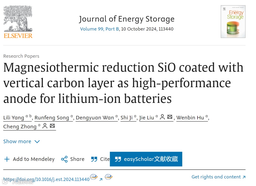 L. Yang, R. Song, D. Wan, S. Ji, J. Liu, W. Hu, C. Zhong, Magnesiothermic Reduction SiO Coated with Vertical Carbon Layer as High-performance Anode for Lithium-ion Batteries. Journal of Energy Storage, 99 (2024) 113440.