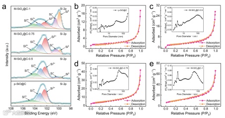 图2. (a) p-SiO@C和M-SiOx@-R复合材料的Si 2p XPS光谱和(b-e) N2吸附和解吸等温线和相应的孔径分布(插图)。
