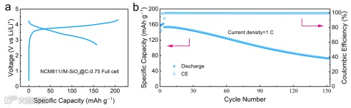 图6. NCM811//M-SiOx@C-0.75全电池的电化学性能。(a) 电压分布图,(b) 循环曲线及对应的库仑效率。