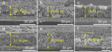 图7. (a, d) M-SiOx@C-0.5,(b, e) M-SiOx@C0.75,(c, f) M-SiOx@-1循环前和循环100次后的SEM横截面图。