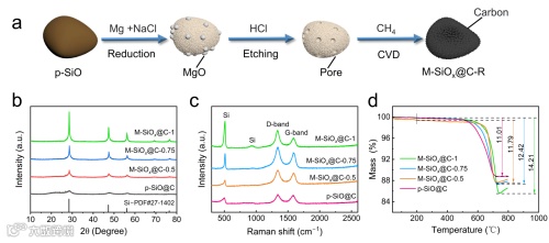 图1. (a) 合成M-SiOx@C-R的过程示意图。(b) p-SiO@C和M-SiOx@C-R样品的XRD图谱,(c)拉曼光谱,(d) TGA曲线。