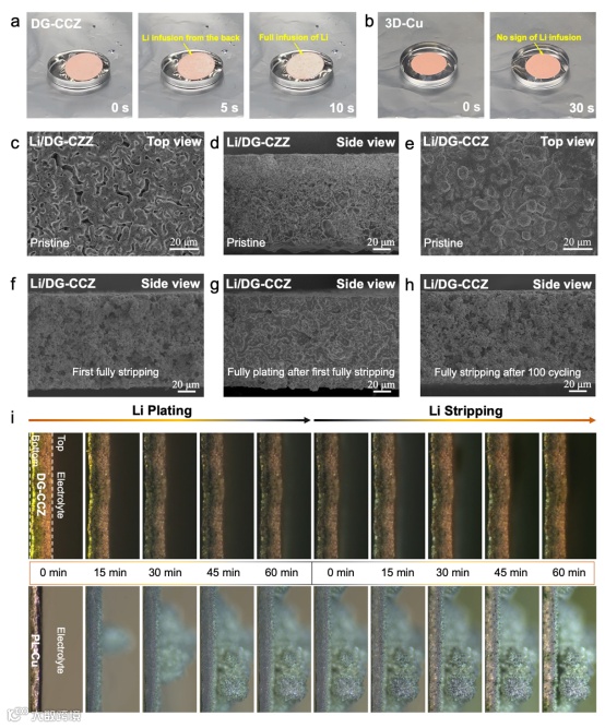 图 3. 熔融锂的毛细管润湿行为表征以及DG-CCZ集流体中的锂沉积/溶解行为表征。
