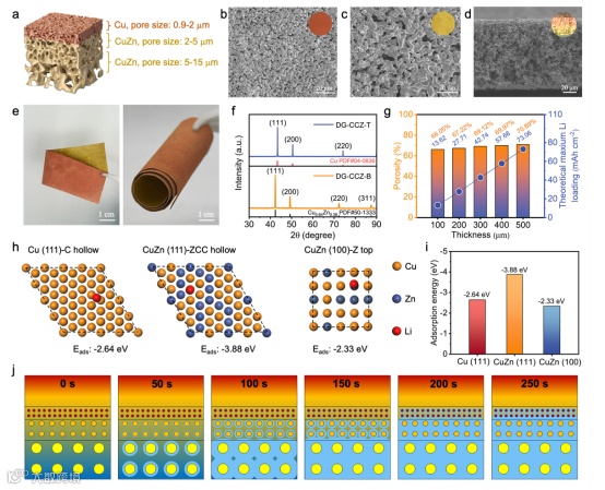 以往将锂金属与多孔铜进行复合的研究过程多使用电化学沉积法,该方法在实验室中虽然容易制得,但在规模化制备中面临着造价高、效率低以及电解液废液环境污染性大等突出问题。因此,发展锂金属与多孔铜集流体的高效和可规模化制备技术,成为锂复合负极领域的研究重点和难点。该工作所制备的DG-CCZ集流体得益于亲锂梯度和孔梯度的协同作用,实现了Li/DG-CCZ复合负极的高效制备。