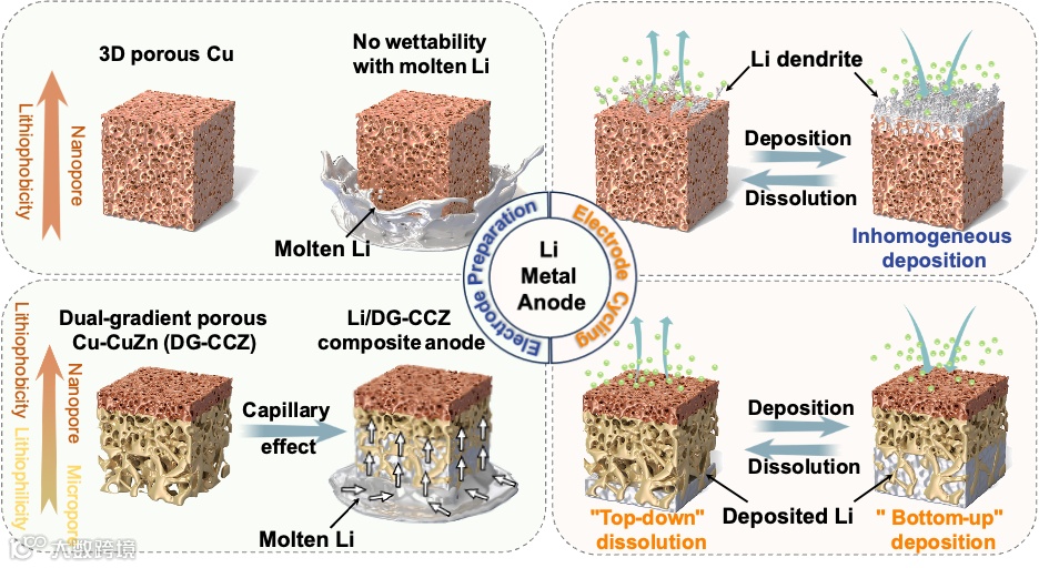 近日,南京邮电大学的马延文教授、赵进教授和陈剑宇副教授课题组联合阿卜杜拉国王科技大学Husam N. Alshareef教授团队,在国际知名期刊ACS Nano上发表题为“Engineering High-Performance Li Metal Batteries through Dual-Gradient Porous Cu-CuZn Host”的文章。该文章构建了具有亲锂-疏锂和微米孔-纳米孔双梯度的多孔铜-铜锌(DG-CCZ)集流体。该集流体通过毛细作用提升了DG-CCZ集流体中熔融锂的浸润速度和深度,实现锂金属的高效融入,此外,DG-CCZ集流体可以诱导电极循环过程中锂金属在多孔铜中“自下而上”沉积和“自上而下”溶解,实现定向扩散,从而有效提升了锂/多孔铜复合负极的高效制备和循环稳定性。