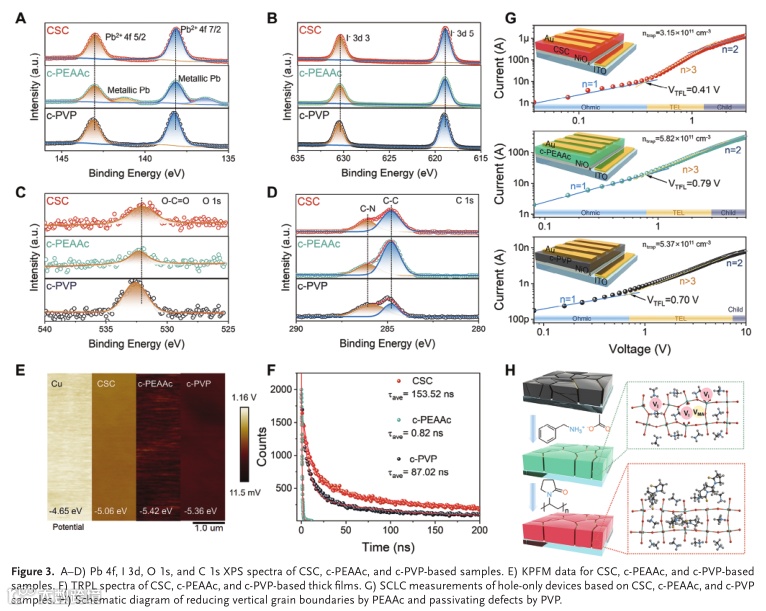 通过XPS表征发现与CSC和c-PVP不同,c-PEAAc中存在明显的金属铅缺陷。该现象产生的原因是Ac-中的羰基与钙钛矿前驱体离子发生强键合,在长时间干燥和退火过程中Ac与MA形成MAAc挥发,导致c-PEAAc中形成大量的离子空位缺陷,在加热过程中进一步演变为金属铅缺陷。但结合截面SEM结果发现在产生消极作用的同时由于PEAAc中羰基与前驱体离子的强键合提高了准二维杂化钙钛矿纵向的结晶度,降低了钙钛矿垂直方向的晶界。PVP则通过与前驱体离子的弱键合抑制了MA+的逃逸,从而抑制离子空位产生。PEAAc和PVP协同作用下能够同时降低准二维杂化钙钛矿的晶界和空位缺陷,从而降低缺陷态密度,提高载流子寿命。