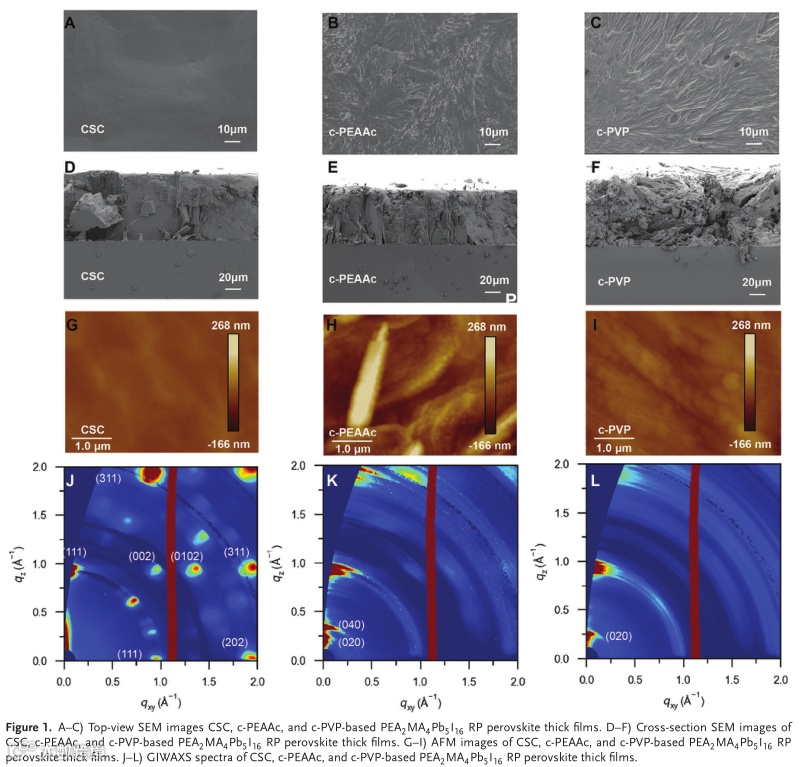 与三维有机无机杂化钙钛矿相比,二维和准二维杂化钙钛矿由于引入了长链有机阳离子,能够抑制离子迁移,具有更高的结构稳定性,同时其能够通过自组装形成面外垂直取向,提高载流子的迁移效率。因此二维和准二维杂化钙钛矿在X射线直接探测领域逐渐受到关注。基于X射线探测应用的钙钛矿需要足够的厚度以满足对高能X射线的充分吸收。然而在厚膜制备过程中,二维和准二维杂化钙钛矿总是在气液界面优先结晶,接着在表面形成“壳”,阻碍溶剂挥发通道,导致严重的体相和表面缺陷。因此,通过溶液制备具有高取向度的准二维钙钛矿厚膜具有很大的挑战。