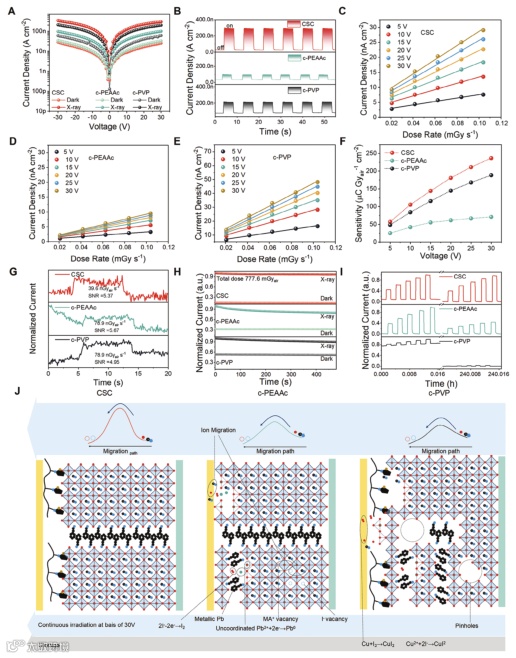 通过羰基阵列协同结晶策略,能够抑制准二维杂化钙钛矿表面结晶速率,从而提高准二维杂化钙钛矿的成膜质量,提高其面外垂直取向度。通过PEAAc中羰基的强键合和PVP中羰基的弱键合相互配合,制备的厚膜具有更低的缺陷态密度。获得的X射线探测器性能得到显著提高。为实现准二维杂化钙钛矿的X射线探测应用提供了理论依据。基于本研究提供了一种抑制二维杂化钙钛矿表面优先结晶的新策略,也是构建更高厚度高质量面外垂直取向准二维杂化钙钛矿的潜在发展方向。