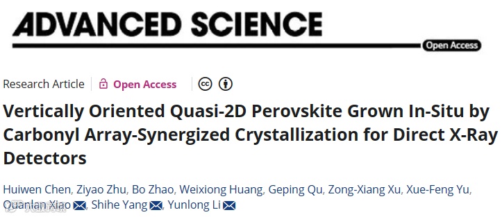 近日,来自中国科学院深圳先进技术研究院的李云龙副研究员课题组与北大深研院杨世和教授团队、深大肖全兰教授团队合作,在国际知名期刊Advanced Science上发表题为“Vertically Oriented Quasi-2D Perovskite Grown In-Situ by Carbonyl Array-Synergized Crystallization for Direct X-Ray Detectors”的研究论文。该研究通过羰基阵列协同结晶策略,抑制了二维杂化钙钛矿表面结晶速率,优化准二维杂化钙钛矿厚膜的垂直取向度、结晶度和量子阱宽度分布。PEAAc和PVP分别降低了准二维杂化钙钛矿的晶界和离子空位缺陷,降低厚膜的缺陷态密度。构建的X射线探测器性能得到提升。