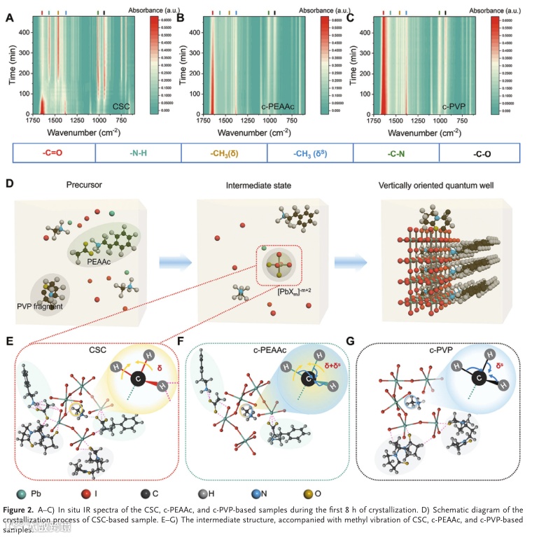 使用傅里叶红外光谱原位追踪准二维杂化钙钛矿CSC、c-PEAAc和c-PVP的结晶过程。通过-C=O与在Pb2+添加前后的改变、结晶过程中-C=O振动峰的蓝移和-N-H振动峰的增强,证明-C=O分别与Pb2+和-N-H通过Lewis酸碱和氢键作用键合,生成大而致密的中间体。同时通过三组样品中-CH3振动由自由度较高的对称变形振动向面内低自由度的不对称弯曲振动的程度,间接证明了CSC结晶过程中形成的中间体较c-PEAAc和c-PVP致密,如图2所示。