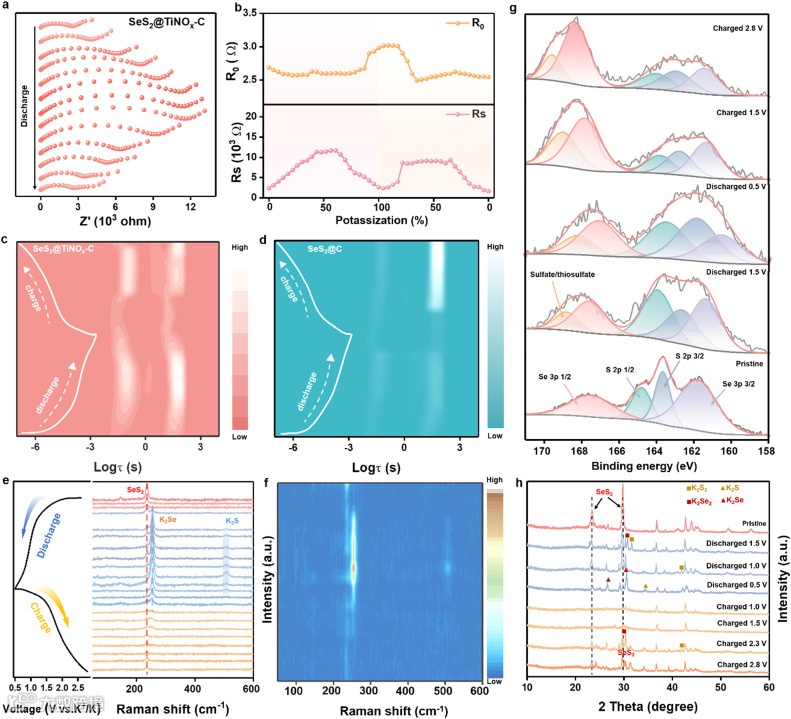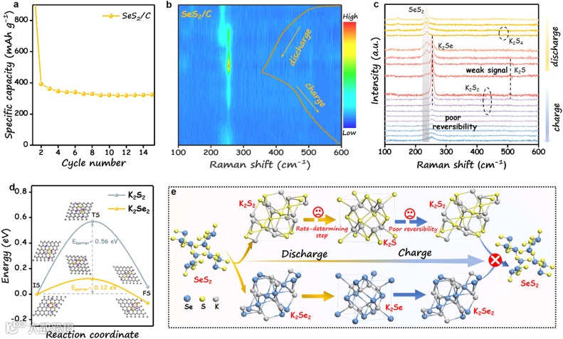 值得注意的是,考虑到硫族电极在充放电过程中的复杂多步反应,确定K-SeS2电池中的决速步骤对于实现SeS2的深度转化至关重要。然而,迄今为止,对于K-SeS2电池的复杂动态转变过程缺乏全面认识,探索K-SeS2电池中的决速步骤仍然是一个巨大的挑战。此外,寻找合适的电催化剂,以加速决速步骤而不促进其他副反应,也是迫切需要解决的关键问题。在这项工作中,作者基于原位拉曼技术和DFT计算,发现从K2S2到K2S的转化是K-SeS2电池中的决速步骤。决速步骤的不完全转化及其较差的可逆性是K-SeS2电池性能不佳的根本原因。此外,作者通过原位缺陷工程开发了一种高效的电催化剂TiNOx。TiNOx对决速步骤的靶向催化作用通过DFT计算和实验结果得到了体现。基于选择性催化机制SeS2@TiNOx-C正极具有806.6 mAh g−1的高可逆容量,以及出色的循环稳定性。各种原位和非原位表征阐明了电化学反应机理,并验证了SeS2正极的可逆性显著提高。总的来说,这项工作深入了解了K-SeS2电池容量较低的原因,并提出了一种提高SeS2正极储钾性能的有效策略。