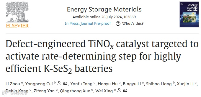 近日,来自中国石油大学(华东)的邢伟教授与中国石油大学(北京)崔永朋特聘教授合作,在国际知名期刊Energy Storage Materials上发表题为“Defect-engineered TiNOx catalyst targeted to activate rate-determining step for highly efficient K-SeS2batteries”的研究性论文。这项工作为K-SeS2电池的性能不足提供了全面的见解并为用于高效K-SeS2电池的电催化剂提出了一种有效的策略。