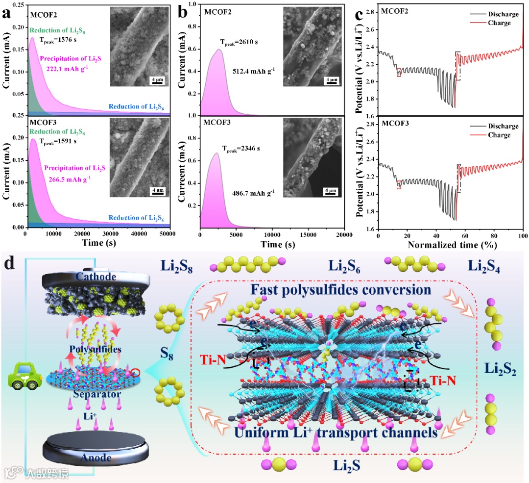 图5 Li2S(a)成核和(b)溶解曲线,(c)GITT曲线;(d)MCOF改性隔膜抑制多硫化物穿梭和锂枝晶生长的示意图。