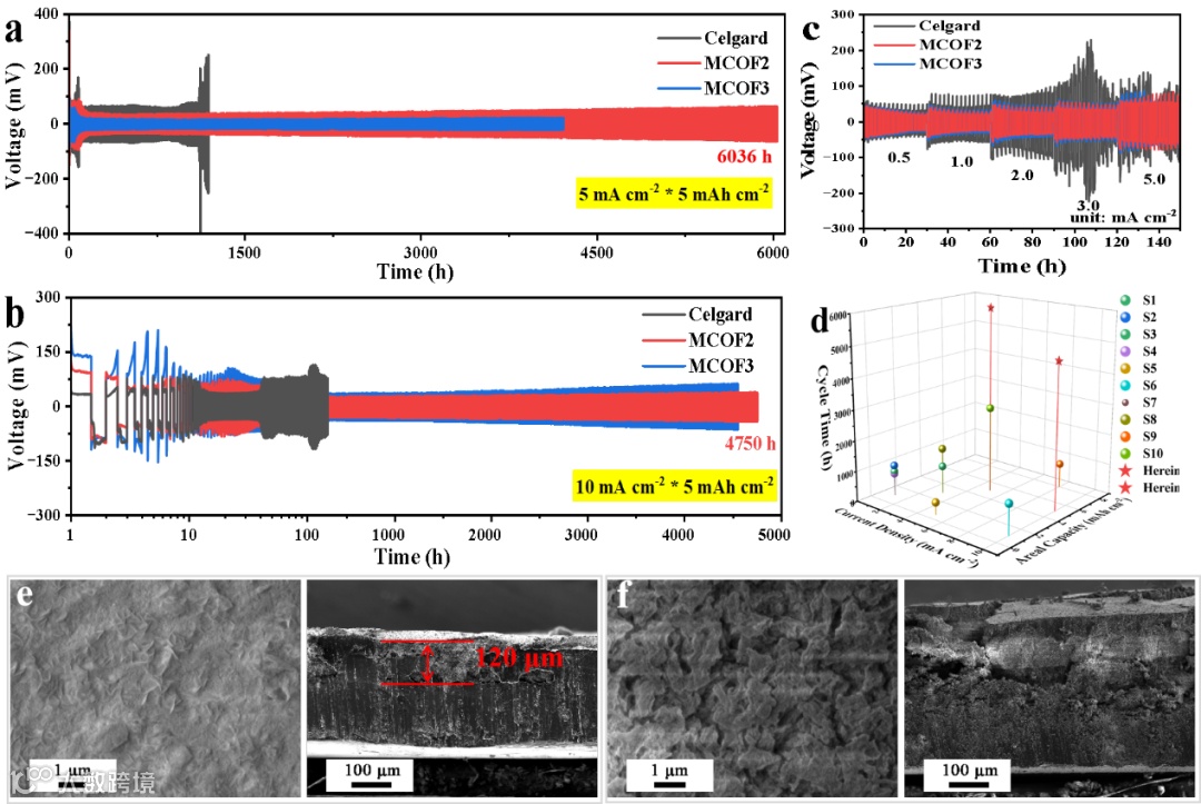 图6 锂对称电池性能:(a)5 mA cm2和(b)10 mA cm2下不同隔膜组装锂对称电池的电压-时间曲线,(c)倍率性能,(d)对称电池性能对比;(e)MCOF2修饰隔膜和(f)Celgard隔膜组装对称电池在循环后的锂片的表面和截面的SEM图片。