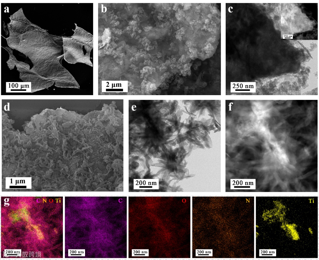 图2 MCOF的形貌表征:(a)MXene的SEM图片;MCOF2的(b)SEM和(c)TEM图片;MCOF3的(d)SEM、(e)TEM、(f)HAADF及(g)相对应的能谱图片。