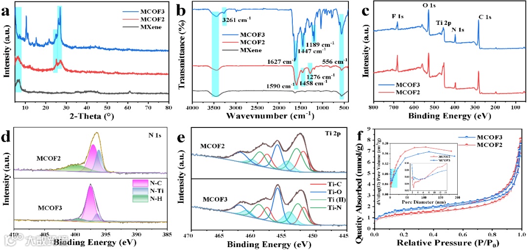 图3 MCOF的结构表征:(a)XRD,(b)FTIR,(c)XPS全谱,(d)N 1s,(e)Ti 2p和(f)N2吸附/脱附曲线和孔径分布曲线。