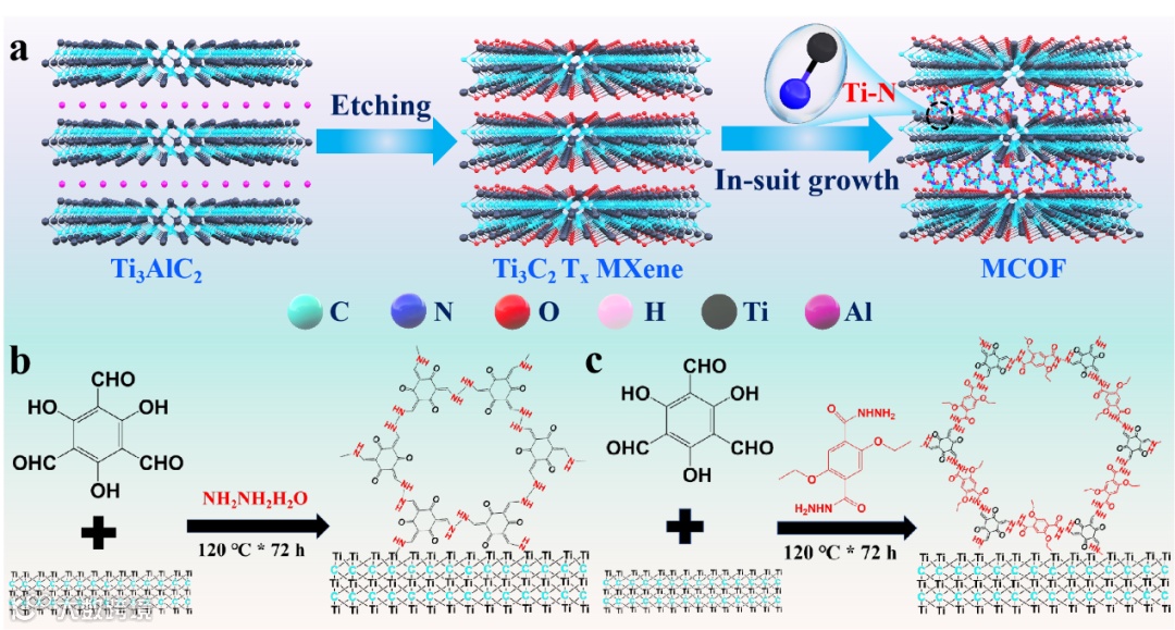 基于此,西北工业大学贺亦柏课题组在国际知名期刊Advanced Functional Materials上发表题为:“Designing Organic-Inorganic Hybrid Materials to Construct a Complementary Interface with Versatility for Li-S Batteries”的研究工作。本研究中,以MXene作为基底材料,通过Ti-N键的结合,实现了COF在MXene表面的原位生长。