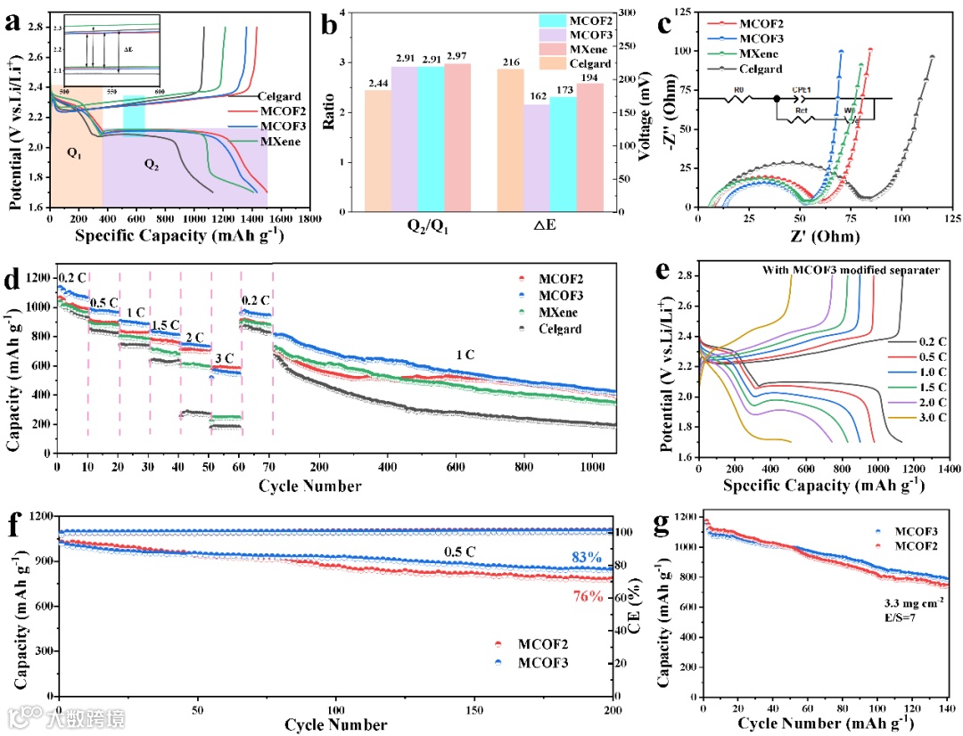 图7 锂硫电池性能:(a)不同隔膜组装电池在0.1 C下的充放电曲线,(b)Q2/Q1值和ΔE值;(c)EIS曲线;(d)倍率性能和1 C下的长循环性能,(e)以MCOF3隔膜组装电池在不同倍率下的充放电曲线;(f)0.5 C下的循环性能和(g)高载量性能。