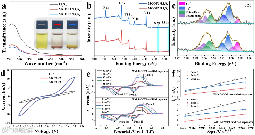 图4 (a)紫外光谱及可视化吸附测试,多硫吸附后的(b)XPS全谱和(c)S 2p光谱;(d)对称电池的CV曲线;(e)锂硫电池的CV曲线及(f)相应的峰值电流与扫描速度平方根的拟合曲线。