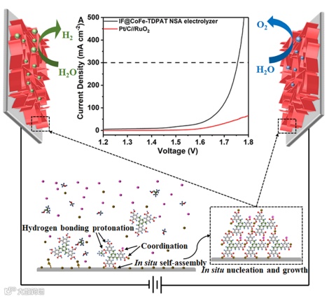 图1. 三维垂直排列、相互连接的CoFe TDPAT MOF纳米片阵列在泡沫铁上的原位自组装及其作为双功能催化电极在全电解水中的应用。