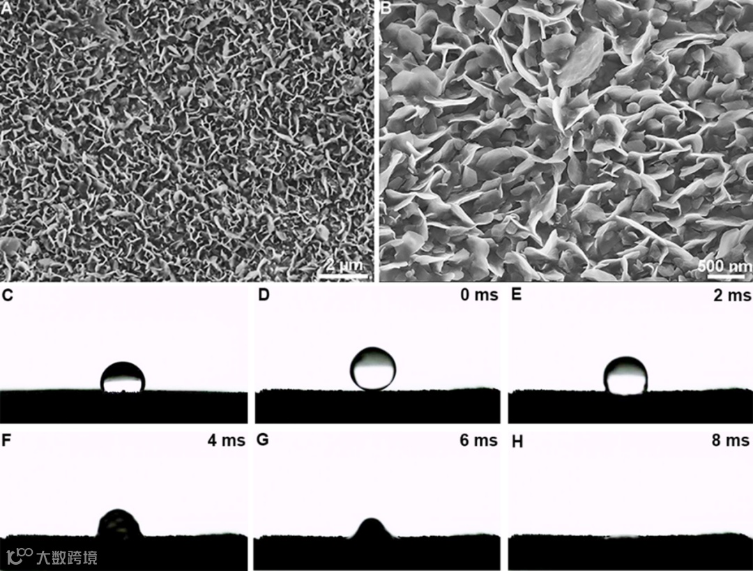 图4 (A–B)在不同放大倍数下IF@CoFe-TDPAT NSA的FESEM图像;IF的接触角图像(C)、IF@CoFe-TDPAT NSA不同时刻的接触角图像(D-H)。