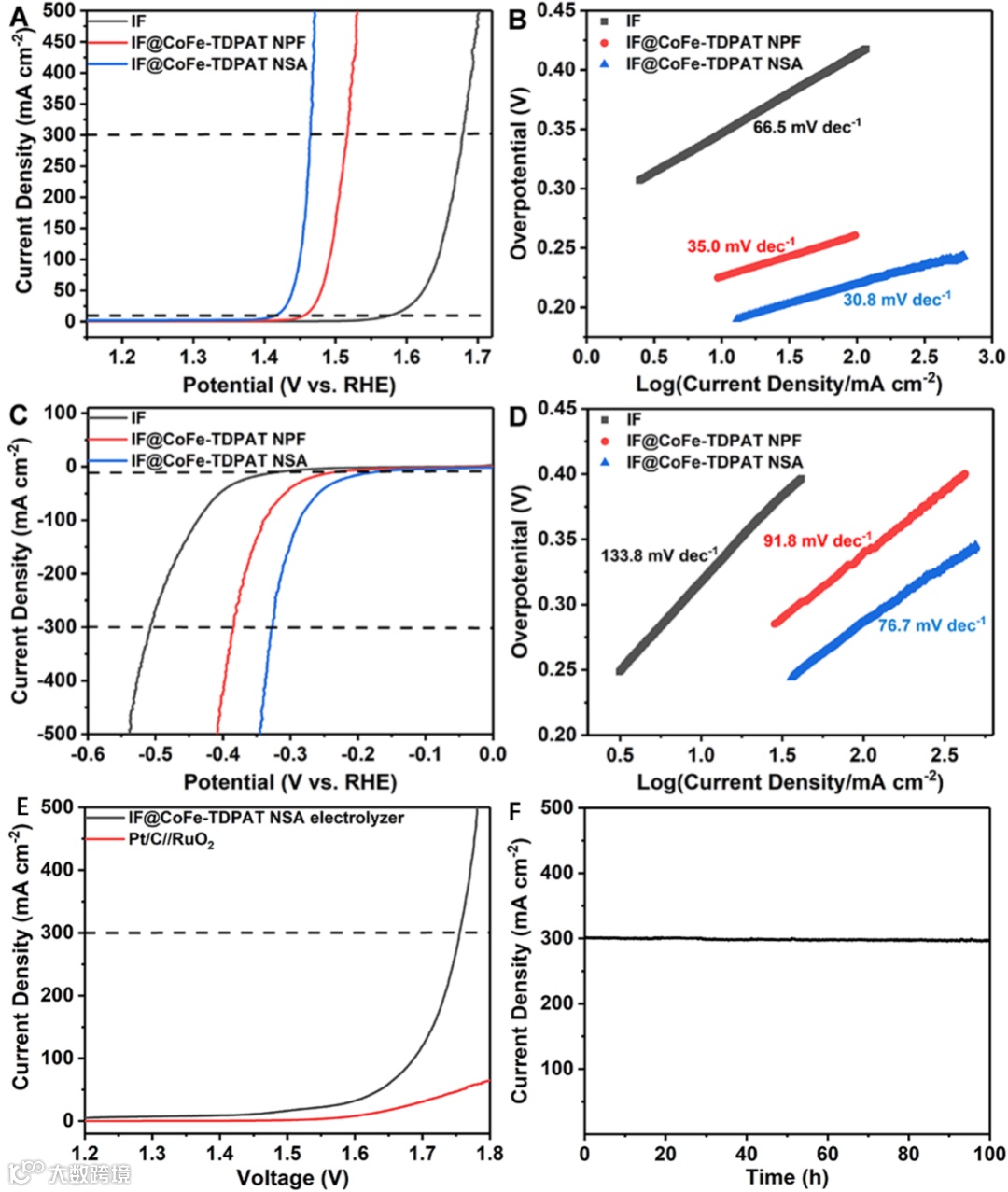 本研究中通过溶剂热法在IF上可控地自组装出大面积、高密度、垂直排列且互连的IF@CoFe-TDPAT NSA。该催化电极在OER和HER中分别以234.0 mV和326.9 mV的过电位实现300 mA cm-2的电流密度,且Tafel斜率分别为30.8 mV dec-1和76.7 mV dec-1。该OER性能表现出远优于大多数已报道的催化剂,甚至超过了基于钌和铱的催化剂的活性,其HER的活性也高于大多数基于MOF的催化剂。将其作为阳极和阴极组装成电解槽后,在1.753 V电压下实现300 mA cm-2电流密度,且100小时后电流密度衰减极小。这一性能是最近报道的无贵金属水电解槽中的最高值,甚至远高于使用商业贵金属催化剂的性能。
