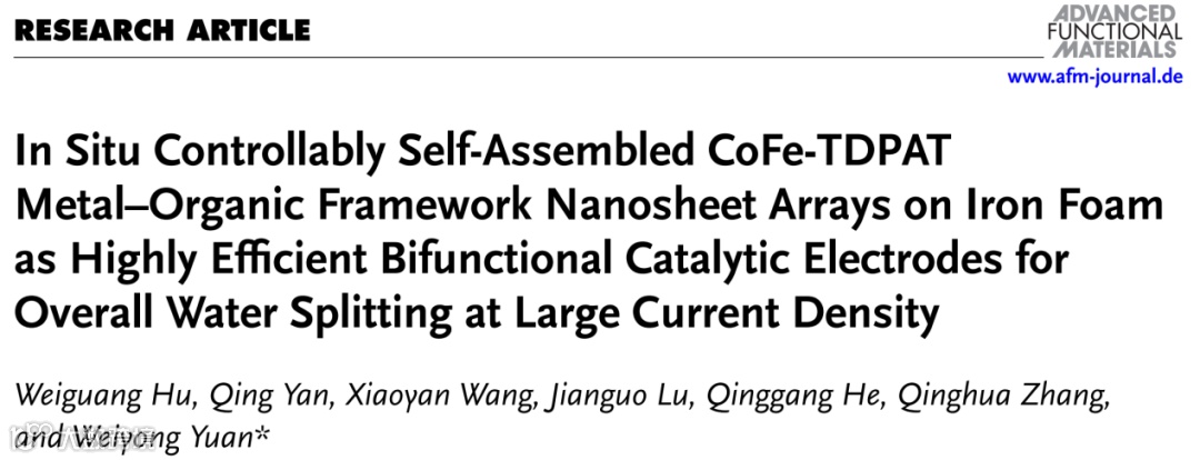 近日,来自浙江大学的袁伟永研究员团队,在国际知名期刊Advanced Functional Materials上发表题为“In Situ Controllably Self-Assembled CoFe-TDPAT Metal–Organic Framework Nanosheet Arrays on Iron Foam as Highly Efficient Bifunctional Catalytic Electrodes for Overall Water Splitting at Large Current Density”的文章。该研究首次采用5,5',5''-((1,3,5-三嗪-2,4,6-三基)三(氮杂二基))三间苯二甲酸(H6TDPAT)作为有机配体,在泡沫铁(IF)上原位可控自组装了一种钴铁双金属有机框架(BMOF)纳米片阵列(NSA)。所得的IF@CoFe-TDPAT NSA在OER中表现出远优于大多数已报道的催化剂,甚至超过了基于钌和铱的催化剂的活性,并且在HER中的活性也高于大多数基于MOF的催化剂。作为全电解水双功能电极使用时,它在1.753 V下达到300 mA cm-2,并且在100小时后表现出可以忽略的电流衰减。这一性能是最近报道的无贵金属水电解槽中的最高值,甚至远高于使用商业贵金属催化剂的性能。该研究提供了一种经济、简便、可控的策略来制备低成本、高效的双功能BMOF纳米结构阵列电极用于大电流密度水分解,同时也为原位自组装和3D自支撑的复杂有机配体基BMOF纳米结构的优异OER和HER性能的机制提供了新见解。