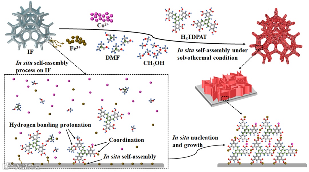 图2 CoFe-TDPAT MOF纳米片阵列在IF上的原位自组装机制示意图