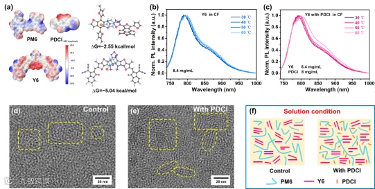 图2. (a) PM6, Y6, PDCI的静电势分布和PM6:Y6, PM6:Y6+PDCI的结合能;氯仿溶液中温度依赖的PL曲线:(b) Y6 和 (c) Y6+PDCI;冷冻电镜:(d) 控制和 (e) PDCI处理的混合膜;(f) PDCI处理对PM6:Y6共混物形貌的影响示意图。