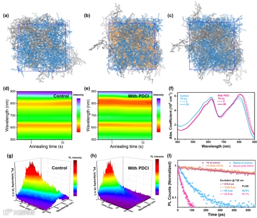 图3.分子动力学模拟得到的最终分子状态图:(a) PM6:Y6,(b) PM6:Y6+PDCI 和(c) PM6:Y6 (去除PDCI);(d) 对照和(e) PDCI处理混合薄膜原位吸收;(f)对照组和PDCI处理混合薄膜的吸收系数;(g) 对照组和(h) PDCI处理混合薄膜的三维时间分辨荧光光谱;(i) 在峰值荧光位置跟踪Y6纯膜和对照及PDCI处理样品的混合薄膜的TRPL动力学。