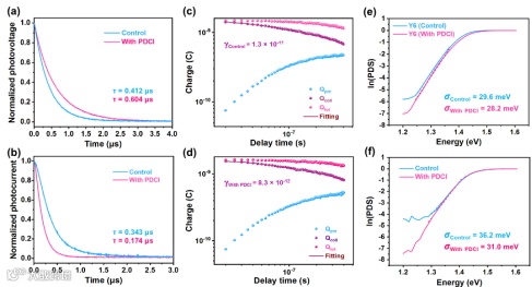 图4.对照和PDCI处理器件:(a)瞬态光电压和(b) 瞬态光电流;(c)和(d)分别展示了对照和PDCI处理器件的时间延迟电荷收集图谱;(e)和(f)展示了对照和PDCI处理混合薄膜的光热偏转光谱。