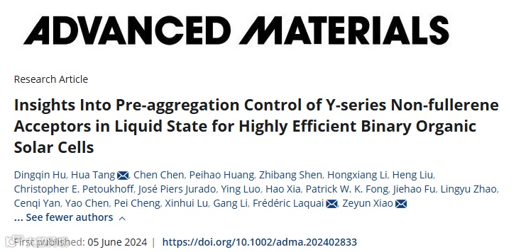 近日,阿卜杜拉国王科技大学Frédéric Laquai教授团队与中国科学院重庆绿色智能技术研究院肖泽云研究员团队合作提出了一种简单而有效的固体添加剂诱导的预聚集控制方法,采用2-氯-5-碘吡啶(PDCI)进一步释放Y系列非富勒烯受体潜力,以实现有机太阳能电池的效率突破。研究成果以题为“Insights into Pre-aggregation Control of Y-series Non-fullerene Acceptors in Liquid State for Highly Efficient Binary Organic Solar Cells”发表在国际著名期刊Advanced Materials上,DOI:10.1002/adma.202402833。