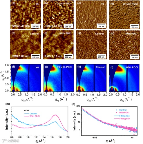 图5. (a) Y6,(b) PDCI处理的Y6纯膜,(e) 对照组和 (f) PDCI处理的混合薄膜的AFM高度图;(c) Y6,(d) PDCI处理的Y6纯膜,(g) 对照组和 (h) PDCI处理的混合薄膜的AFM相位图;(i) Y6,(j) PDCI处理的Y6纯膜,(k) 对照组和 (l) PDCI处理的混合薄膜的二维GIWAXS图;(m) 相应二维GIWAXS数据(混合薄膜)的面外线曲线和(n) GISAXS曲线。
