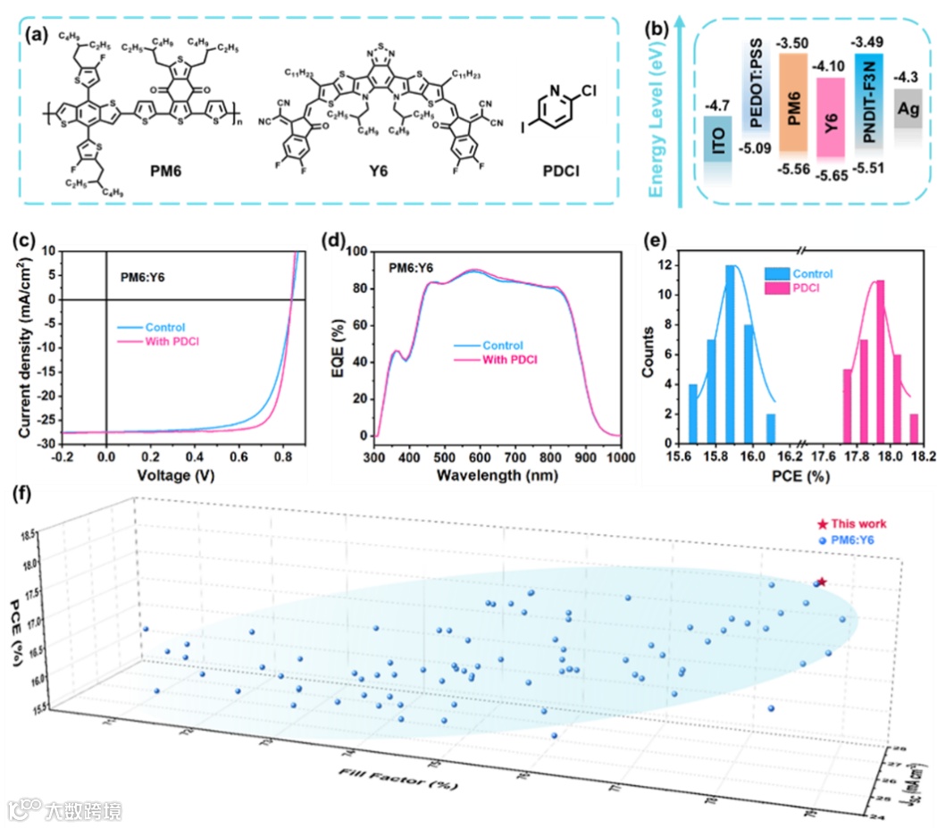 图1. (a) PM6, Y6和 PDCI的分子结构;(b) ITO, PEDOT:PSS, PM6, Y6, PNDIT-F3N, 和Ag的能级;控制器件和PDCI处理器件的(d) J-V, (c) EQE , 和 (e) 效率分布曲线;(f) 近几年,二元PM6:Y6体系的PCE与JSC和 FF 的发展图谱。