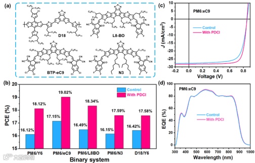图 6. (a) 聚合物给体的非富勒烯受体的结构图;(b) 对照和PDCI处理的器件效率分布图;对照和PDCI处理的PM6:eC9有机太阳能电池:(c) J-V 和 (d) EQE曲线。