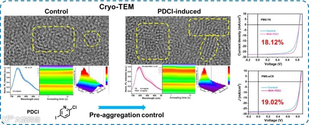 本工作报告了一种简单而有效的固体添加剂诱导预聚集控制方法,采用PDCI来进一步释放Y系列非富勒烯受体的潜力。具体而言,PDCI主要与Y系列非富勒烯受体相互作用,在溶液中实现增强且有序的相聚集。这种方法在薄膜形成过程中显著改善了受体相的吸收并红移,同时提高了结晶度。此外,PDCI诱导的NFA预聚集在溶液中通过精细的中间态转变,能够在薄膜形成过程中实现有序的分子排列。因此,PDCI诱导的预聚集将PM6:Y6 体系的效率从16.12%显著提高到18.12%,并在PM6:eC9系统中实现了19.02%的高效率值。此外,我们提供了详细的预聚集调控数据,如采用冷冻电镜(Cryo-TEM)和温度依赖的PL测量证明PDCI诱导的预聚集控制方法促进了Y系列非富勒烯受体在溶液中的有序相聚集,并通过原位紫外-可见吸收光谱证明在薄膜形成过程中受体相的吸收红移和结晶度的提高。此外,我们还通过快速光谱、形貌表征和计算模拟系统阐明了PDCI诱导预聚集控制方法的工作机制,从而为开发高效有机太阳能电池提供了新思路。