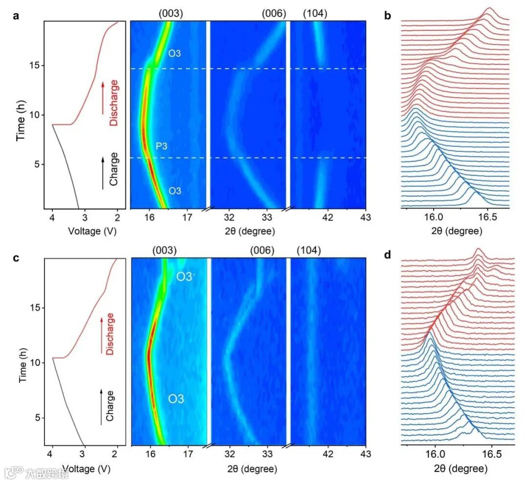 图一:原位XRD演变。(a, b)Na-HE,(c, d)NLNM。