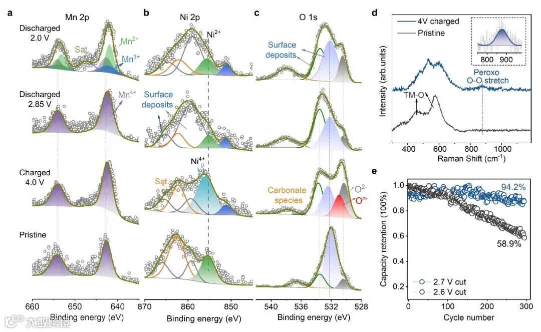 鉴于Na-HE正极的放电比容量为122.6 mAh g-1,大于基于过渡金属电荷补偿的比容量,因此收集了O 1s 的XPS光谱结果,530.4 eV 处的峰值代表 O2-(晶格氧),在充电至 4.0 V 的过程中转移到 ≈531 eV 的高能区,这是氧氧化还原的信号(On-)。同时,拉曼光谱具有检测共价键的强大能力,因此被用来研究氧二聚体的信息。在800-900 cm-1 处出现了一个小峰,对应于 4.0 V电极的O-O伸展区域,这与XPS结果一致。表明在Na-HE中激发了氧活化,而同样有Li掺杂的NLNM却没有发现氧活化,形成了鲜明对比。