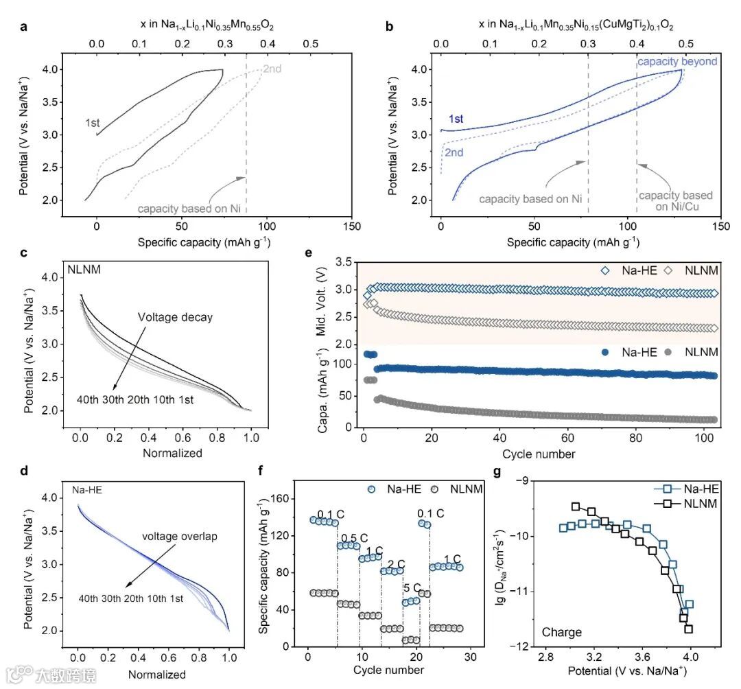 对Na-HE和NLNM,在13 mA g-1的电流密度下,2.0 V-4.0 V 的电压窗口内,NLNM的比容量为81 mAh g-1,相当于 0.3 e转移,这表明其比容量小于基于 Ni2+/3+ 电荷补偿的容量(单电子反应,0.35 e转移)。与此形成鲜明对比的是Na-HE的比容量为122.6 mAh g-1,相当于0.5 e转移。而Na-HE中只有0.15 摩尔 Ni2+ 和 0.1 摩尔Cu2+(活性过渡金属),这意味着 Na-HE的电荷容量大于基于Ni2+/4+氧化还原(2 e 反应)的比容量,甚至大于基于Ni2+/4+和 Cu2+/3+ 电荷转移的比容量(总计 0.4 e转移)。因此高熵策略诱导了活性元素的充分利用。XPS结果同样印证了这点,Na-HE初始状态下Ni2+ 的结合能为 855.1 eV,而充电至 4.0 V 后则升至 855.9 eV,这是 Ni4+ 的信号。在放电过程中,Ni4+ 被还原成 Ni2+。而NLNM中Ni的氧化还原不同之处在于,4.0 V 充电状态显示的是 Ni3+ 信号,而不是 Ni4+。