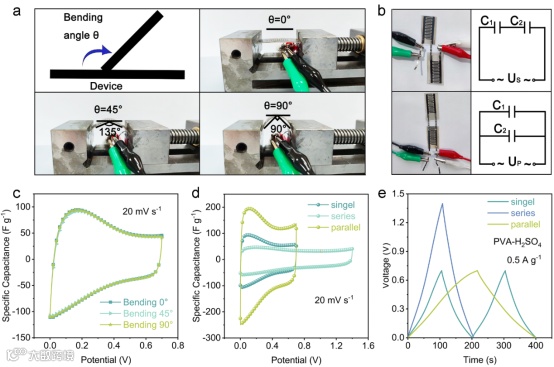 图7. 超级电容器的柔性、串并联测试。
