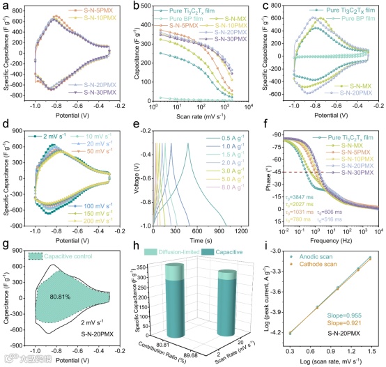 循环伏安法测试中能够观察到两对明显的氧化还原峰,其中位于-0.9 ~ -0.7V的较宽的峰,可归因于MXene自身的赝电容行为。而一对新的位于-0.7~-0.5V的较窄的峰,归因于BP表面发生的氧化还原反应。虽然原始BP电化学活性较低,但通过与MXene纳米片形成Ti-O-P键,可以形成具有电化学氧化还原活性的位点。这种化学结合提供的新的活性位点增强了S-N-PMX薄膜的电化学性能。并且S、N杂原子的掺杂也进一步提供大量氧化还原活性位点,进而使自组装的多孔S-N-BP/Ti₃C₂Tx异质结构薄膜显示出显著提升的电容性能。此外,S-N-PMX薄膜表现出了优异的速率性能,速率性能的提升可归因于三维互联多孔结构的形成,多孔结构极大的改善了离子输运通道,并允许电解质离子的快速输运到层间。同时,BP纳米片的引入能够抑制MXene纳米片的自重堆积,改善电极的层间结构,并最大化的提升了S-N-PMX薄膜的倍率性能。