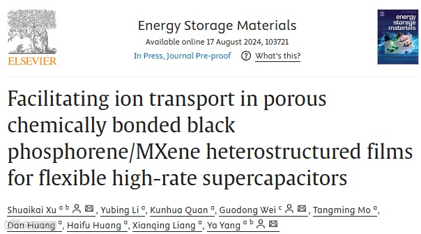 近日,广西大学徐帅凯副教授、中科院北京纳米所杨亚研究员、陕西科技大学尉国栋教授合作,在国际知名期刊Energy Storage Materials上发表题为“Facilitating ion transport in porous chemically bonded black phosphorene/MXene heterostructured films for flexible high-rate supercapacitors”的文章。通过静电自组装与热发泡工艺相结合,制备了S/N杂原子修饰的多孔BP/Ti₃C₂Tx异质结构薄膜。所制备的多孔异质结构薄膜厚度不仅达到甚至超过工业标准,作为超级电容器电极材料能够显著提升比电容,并展现出优异的倍率性能以及高的能量密度和功率密度。