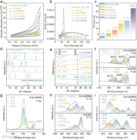 制备单层或少层的纳米片对于形成均匀的层状异质结构至关重要,因为单层纳米片的结合能够更均匀地形成层状异质结构。为此制备的平均厚度约为1.2 nm的Ti₃C₂Tx纳米片以及平均厚度约为0.9 nm的BP纳米片。由BP、MXene静电自组装获得的异质结构薄膜中,BP纳米片与Ti₃C₂Tx纳米片的单层厚度有助于增强两组分之间的界面相互作用及层间离子/电子传输,BP能够通过与MXene表面的含氧官能团进行键合形成P-O键,这种化学结合有利于高效的电荷转移与形成更稳定的结构。在热发泡处理后,发泡剂的分解能够促使电极薄膜形成一个三维互联的多孔网络,并随着BP含量的增加,薄膜孔结构逐渐变得更加开放和发达,同时薄膜的孔隙率和孔径也均有所增加,相比于原始MXene薄膜的致密堆叠结构,这种相互连接的多孔结构更有利于电解质的快速输运。此外,发泡剂的热分解产生的气体还能够作为S、N源,实现对MXene电极的杂原子修饰,增加其氧化还原活性位点,进一步提升MXene电极的电化学活性。