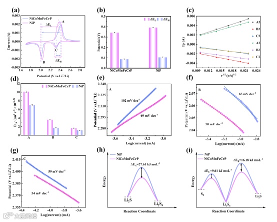 要点三:在NiCoMnFeCrP的CV曲线中氧化还原峰对应着更高的峰电流,表明其对LiPSs的氧化还原反应具有更高的催化效率。NiCoMnFeCrP中表现出更大的DLi+,验证了其促进Li+迁移动力学的能力更强。在NiCoMnFeCrP的CV曲线中氧化峰(峰A)和还原峰(峰B和C)处的Tafel斜率值明显低于NiP,这表明NiCoMnFeCrP更有利于促进LiPSs的氧化还原动力学。NiCoMnFeCrP在降低LiPSs的氧化还原反应的活化能和促进LiPSs转化反应的进展方面发挥着不可或缺的作用。
