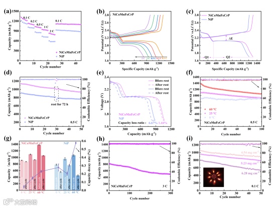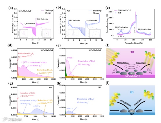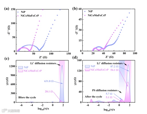 要点六:为了更深入地研究EIS数据中的细节,结合了松弛时间分布分析法对EIS谱进行定量反卷积处理。与NiP相比,NiCoMnFeCrP的Li+扩散阻抗的峰值面积在循环前后都不太显著。在循环后,NiCoMnFeCrP中出现属于多硫化物扩散阻抗的峰,但NiCoMnFeCrP始终展示出较低的多硫化物扩散阻抗。这表明NiCoMnFeCrP使得硫活性物质的利用率变高。