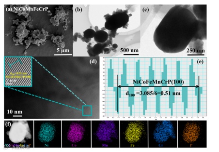 要点一:通过溶胶凝胶法和高温煅烧法合成了NiCoMnFeCrP。SEM和TEM图像显示了NiCoMnFeCrP的微观形貌,其为直径约为500-800nm的球形颗粒。过渡金属元素Co、Mn、Cr和Fe的引入导致NiCoMnFeCrP颗粒变得更小,这改变了催化材料中活性中心的结构和比例。在元素映射图中可以明确地检测到Ni、Co、Mn、Fe、Cr和P的共同存在,且在材料中均匀分布,证实了NiCoMnFeCrP的成功合成。