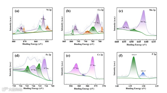 要点二:利用XPS测定了NiCoMnFeCrP的价态和表面化学性质。XPS光谱结果表明,Ni、Co、Mn、Fe、Cr和P共存,并说明了NiCoMnFeCrP的成功合成。