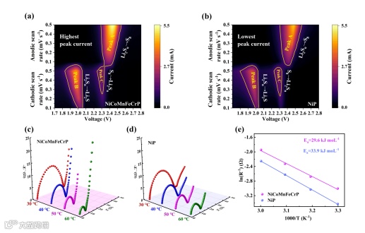 要点四:NiCoMnFeCrP中的A峰区更为明显,显示出更亮的区域和更大的电流峰值,这表明NiCoMnFeCrP更有利于促进Li2Sn向S8的转化。变温阻抗所反映出的数据中NiCoMnFeCrP的Ea小于NiP。这表明,在相同的温度下,NiCoMnFeCrP可以有效降低反应能垒,从而对LiPSs表现出优越的催化性能。
