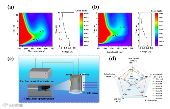 要点八:原位紫外测试提供了一种实时监测聚硫化物的种类变化和反应过程的能力。S3·− 自由基参与了长链可溶性聚硫化物转化为短链聚硫化物,在LiPSs的电化学反应中具有重要意义。随着电化学反应的进行,在NiCoMnFeCrP中可以观察到S3·− 自由基含量的更高。这说明NiCoMnFeCrP可以加速LiPSs的转化过程。此外,NiCoMnFeCrP在相同的电流密度下具有较长的充放电时间,表明其活性物质硫的利用更为充分。