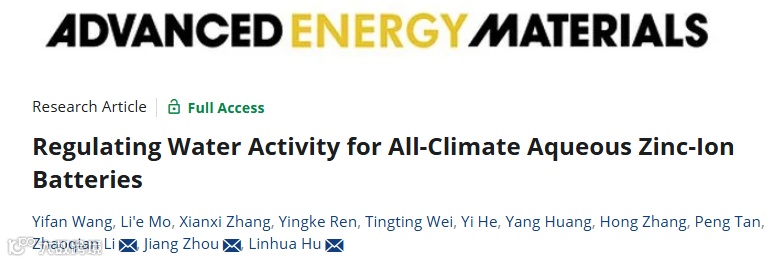 近日,来自中国科学院合肥物质院固体物理研究所的李兆乾副研究员和胡林华研究员与中南大学的周江教授合作,在国际知名期刊Advanced Energy Materials上发表题为“Regulating Water Activity for All-Climate Aqueous Zinc-Ion Batteries”的观点文章。该观点文章提出了一种高效的水调节工程策略,所组装的Zn//NH4V4O10软包电池的放电比容量高达 438.1 mAh g-1,在-30 °C下循环300 次后,比容量仍能达到 254 mAh g-1。